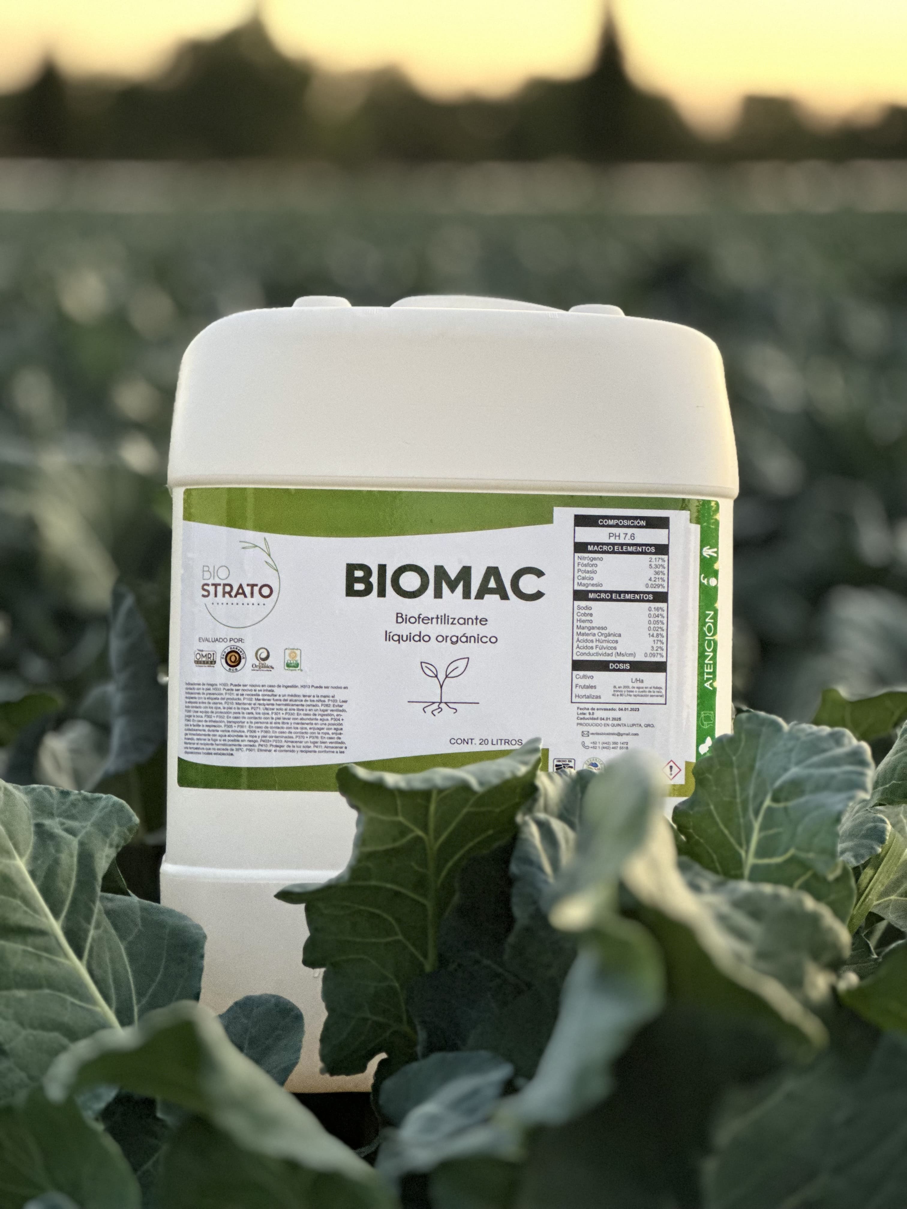 Fertilizante orgánico diseñado para la inyección en zonas radiculares, excelente impulsor para la nutrición y fortalecimiento de cultivos de la Agro, cubriendo desde hortalizas, granos, pastizales, frutales y ornamentales. Biomac ha sido evaluado y aprobado con las normas orgánicas: NOP, JAS/MAFF y la UE, para ser utilizado para la producción orgánica.